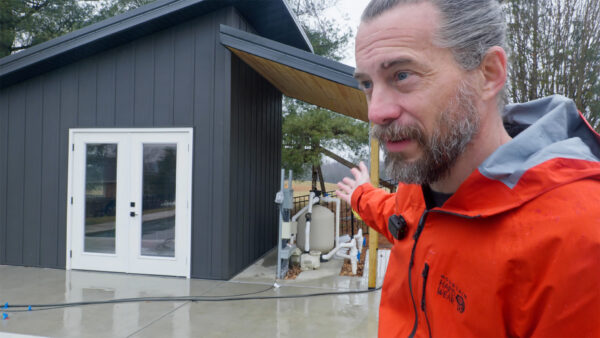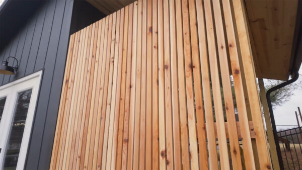I attached the slats vertically with half-inch spacers between them, screwing from the back side so there’d be no visible fasteners on the front. Cedar is flexible enough that each piece needed to be leveled at both the top and bottom, which took some patience—especially in the rain. But the rain actually made the cedar look incredible, bringing out the warm color that’ll show up once I put spar varnish on it. Without a finish, cedar eventually turns gray, and nobody wants that. The varnish will have to wait until everything dries out. With the screen up, the light mounted, and the gutters working, I kind of have to admit the outside of the pool house is done. That’s a little bittersweet, honestly. The last seven months of building this thing have been incredibly gratifying, and I’ve learned a ridiculous amount along the way. Thanks for following along with this whole process—now we get to move to the inside, and that’s going to be a blast. Now, go make something awesome!