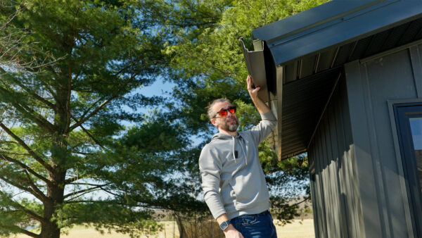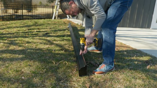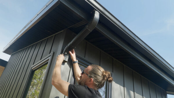 Once the wedges finished printing, I got back to the gutters. The self-tapping screws went through the wedges and into the fascia to set the right angle, and then I could finally mount the gutter with the long gutter screws. It all came together really well. For the downspouts, it was honestly the simplest part of the whole job. You connect a few angled pieces to route from the gutter outlet over to the side of the building, run a straight downspout section down the wall with some straps, and then aim the bottom piece out into the grass. I measured the downspout length by marking about an inch up into the top connector and an inch down from the bottom, cut to fit, and screwed everything together. Based on my very limited experience, gutters are the kind of thing I’m never going to pay someone else to do again. You can totally knock it out in an afternoon.