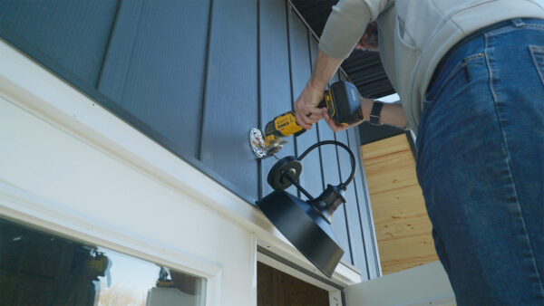 While I waited on the printer to finish, I pivoted to the exterior light. We’d picked out a light to go above the door, but there was no electrical box because there was no electrical anything in the building yet. To make things more interesting, there was a batten almost dead center above the door. I thought cutting into it would be a big deal, but after looking it up, it really wasn’t. That’s also when I discovered pancake boxes, which are these super thin metal electrical boxes that sit on top of the sheathing instead of being built into the framing. I’d never used one before, so I took my time figuring out the approach. I found the center point for the light, scored and cut an opening in the siding to match the box, and then mounted it. The light fixture itself was bigger than the box, so I had to notch into the batten a bit to make it all fit. I can’t test the light yet since there’s no electrical run to the building, but it looks great up there. I’ll need to seal around it with liquid flashing and caulk to keep water out, but that’s a job for another day.