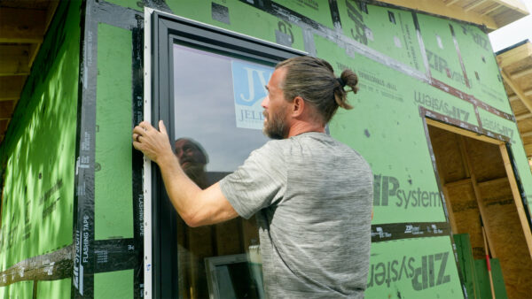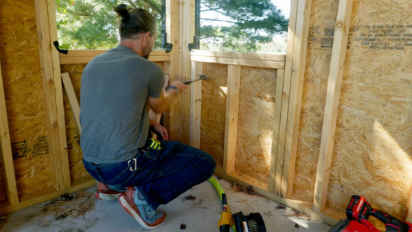 Here’s the thing though—there’s an even better way to do this that I didn’t think about until it was too late. The absolute best time to install those blocks would have been before the sheathing went on. When there’s still an open gap between each rafter, you could just drop the blocks down from the top and nail them in place. You could even use them as spacers to make sure your rafters are exactly the right distance apart. But I didn’t think that far ahead, so I did it the hard way. Either way, those blocks just cover the big openings. I still had to seal them up with expanding foam, which I’d also need for the doors and windows. That meant it was time to start putting in the actual openings, starting with the windows.