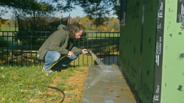 After making that fix and dealing with more rain, I wanted to really test if it worked. I took a hose and created almost a quarter inch of standing water up against the building. If it was going to leak, that should definitely show it. I went inside to check, and everything was completely dry. No water coming through at all. The standing water I created also drained off the wall really quickly, which was a good sign. There’s another solution I learned about from Matt Risinger that I wanted to mention in case anyone else runs into this issue. It involves cutting a small slot in the concrete and installing Z-flashing, which is this metal piece shaped like a Z. One part goes in the slot, another part goes up against the building, and then you tape it in place. The flashing costs about four bucks and creates a drainage path for any water that gets behind the siding. Matt used stainless steel flashing, and I’d probably go that route instead of the galvanized stuff I picked up. It’s a really smart and simple solution that I’ll keep in mind for future projects.